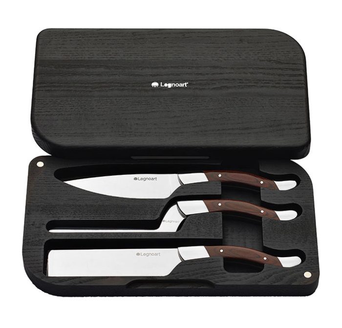 Enrico Albertini tarafından tasarlanan ve Japon paslanmaz çelikten üretilen bu şık set, lüks ahşap masif kutusu ile mükemmel bir hediye seçeneğidir. Setin içinde sert, orta sert ve yumuşak peynirleri rahatça kesmek için tasarlanmış ve tutulma yerleri koyu renkli ahşaptan üretilmiş 3 farklı bıçak bulunmaktadır.